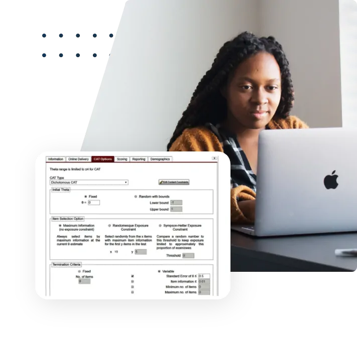 Make your online exams smarter, shorter, and more secure by publishing computerized adaptive tests (CAT). CAT provides a unique exam for each student, personalized by difficulty but also balancing for content coverage and item overexposure. Or, leverage Linear on the Fly Testing (LOFT).