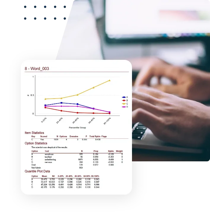 Deliver engaging certification exams or educational assessments that accurately assess examinee knowledge. Provide custom score reports. Integrate results with our systems.